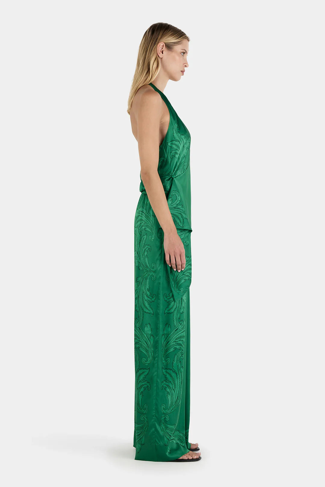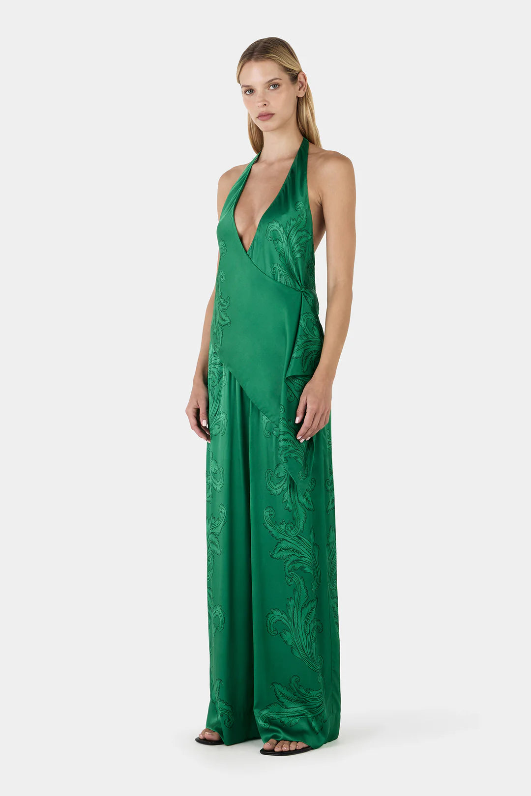 The Aisling Halter is a statement silk satin top featuring a deep plunging halter neckline and an open back. A wrap-style overlay at the front is secured with button and rouleau loop closures, creating soft structure through the bodice. Fully lined for a smooth silhouette and pairs with the Annika Pant for perfect evening styling.