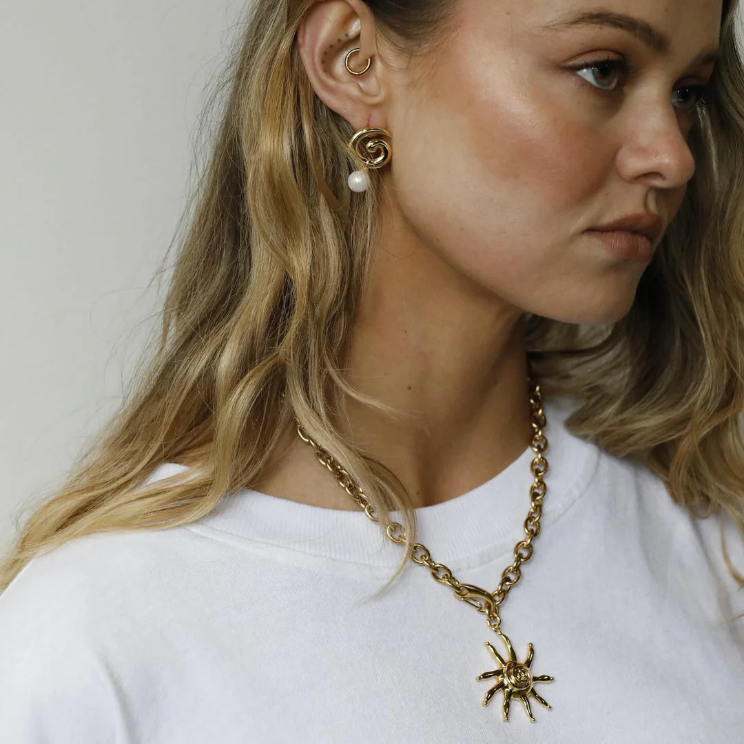 Our small, signature swirl earrings with a baroque, freshwater pearl drop.