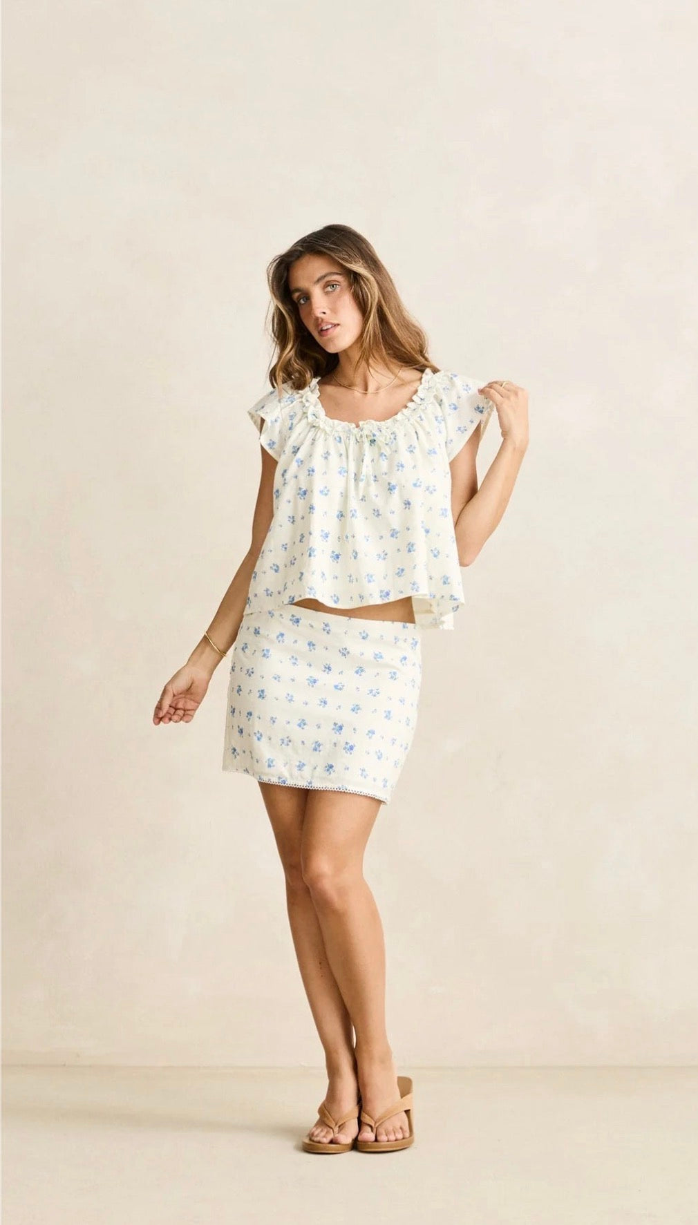 The Dahlia Mini Skirt in Sky is a lightweight ditsy floral piece with lace trim detailing. Designed with a fixed waist and invisible side zip, it’s an elevated skirt for warm days.