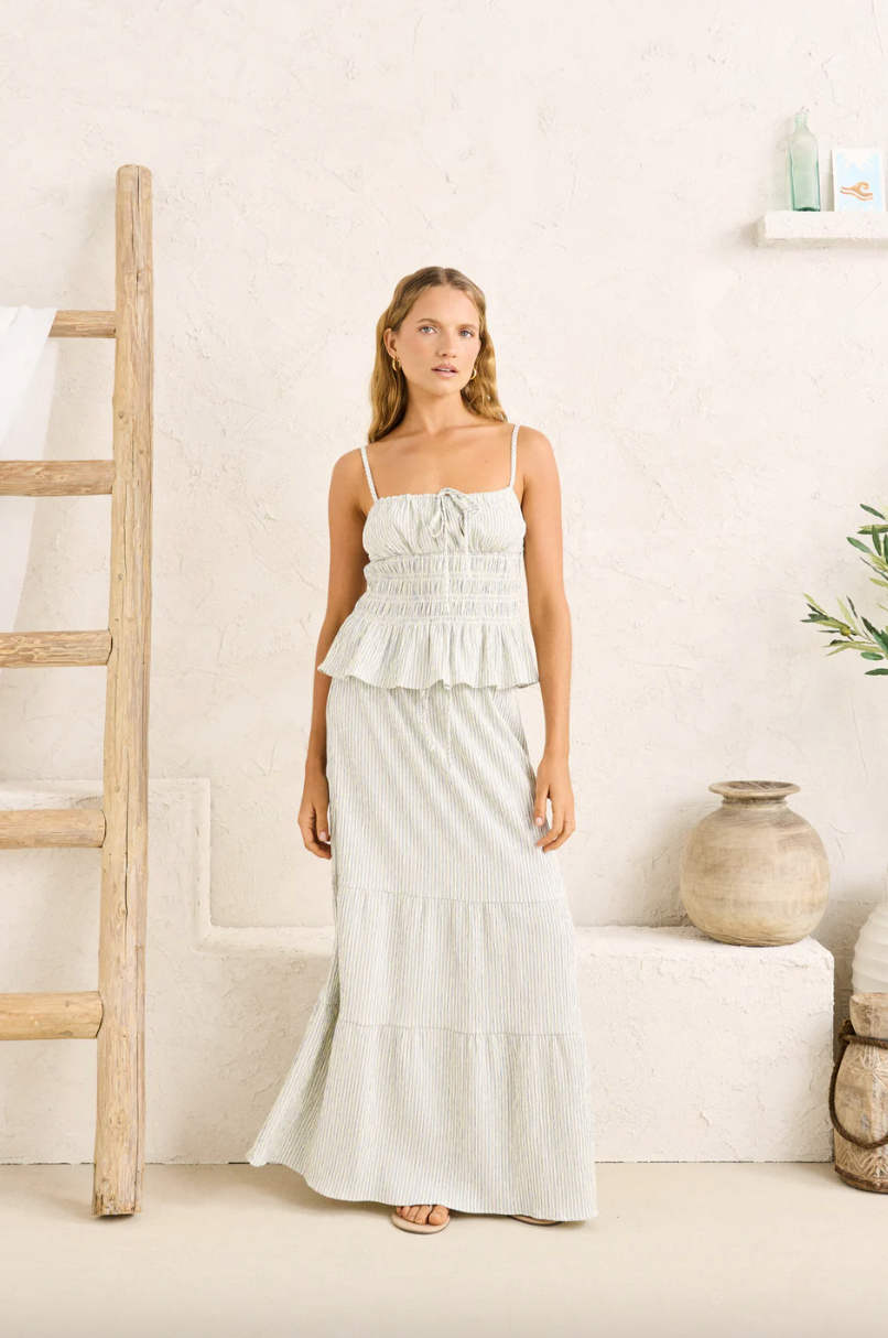 The Driftwood Stripe Top in Cream features adjustable spaghetti straps, a centre front tie, and shirred waist for comfort. Finished in a soft stripe for easy styling.