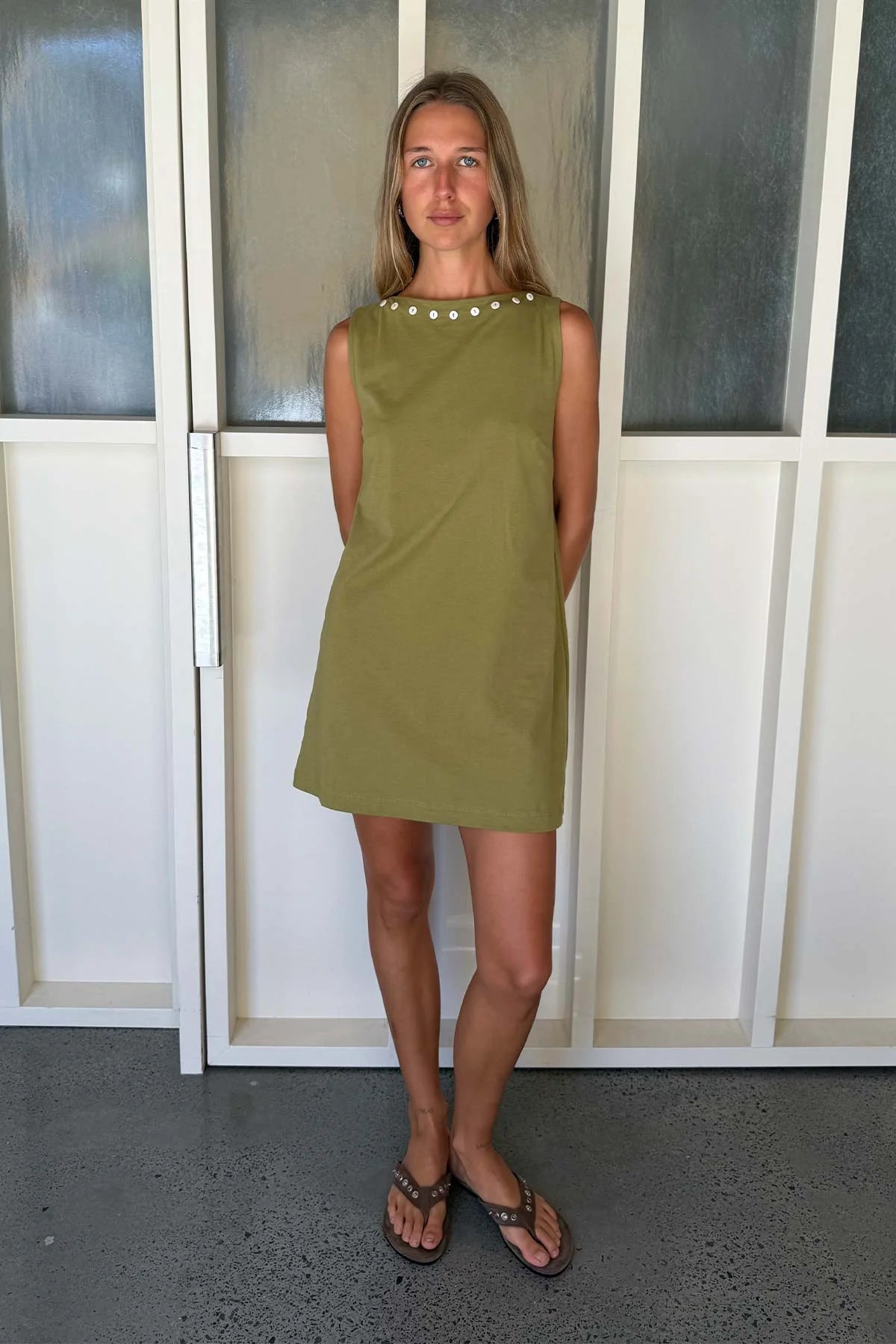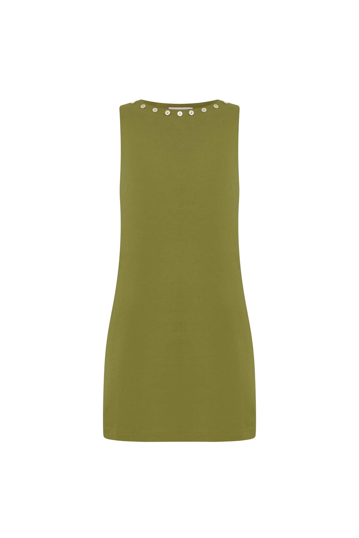 A relaxed tank-style mini designed to let shape and colour do the work. Cut from organic cotton jersey, it features a wide boat neckline with subtle shell button detailing and a straight, easy silhouette. Cleanly constructed with fully bagged edges and a double-layered bust, it delivers a smooth, effortless wear with a fresh seasonal feel.