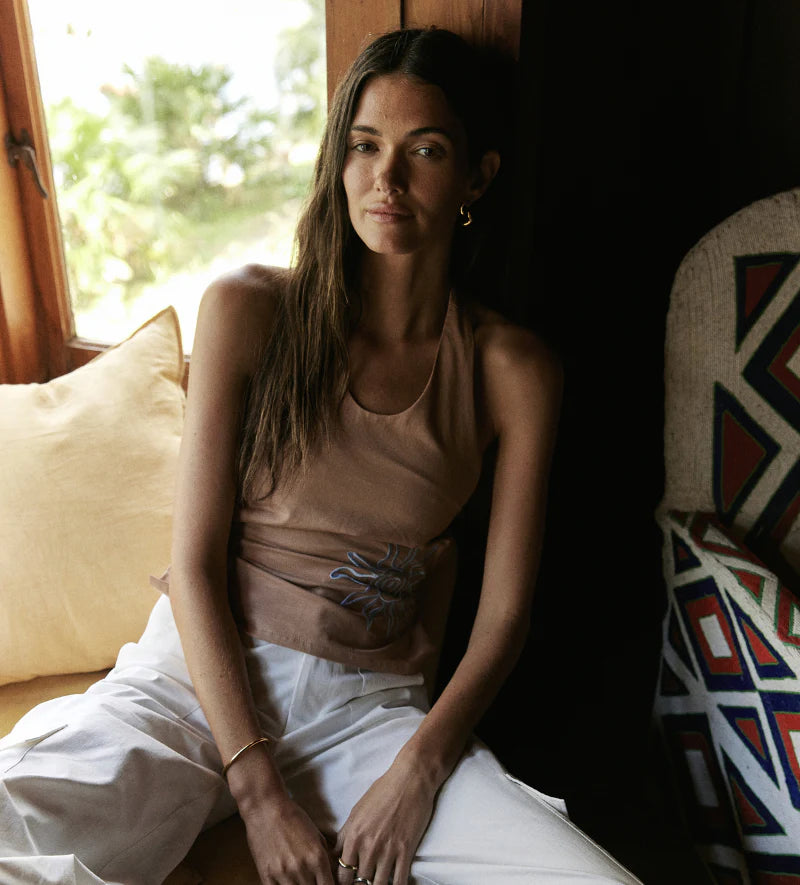 Crafted from a lightweight blend of 55% cotton and 45% linen, the Nacida Halter Top is perfect for warm days and breezy evenings. The subtle Sol embroidery in powder blue, paired with the warm tan linen, adds a refined touch making this piece as charming as it is versatile.