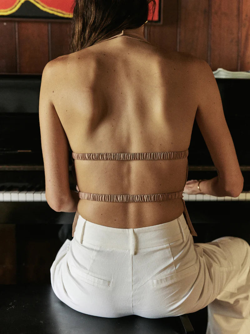 The Nacida Halter Top combines effortless style with delicate details, designed for those who appreciate both comfort and sophistication. This backless halter top features double elasticated straps for a secure and flattering fit. The front is lined with soft cotton, adding an extra layer of comfort and support.