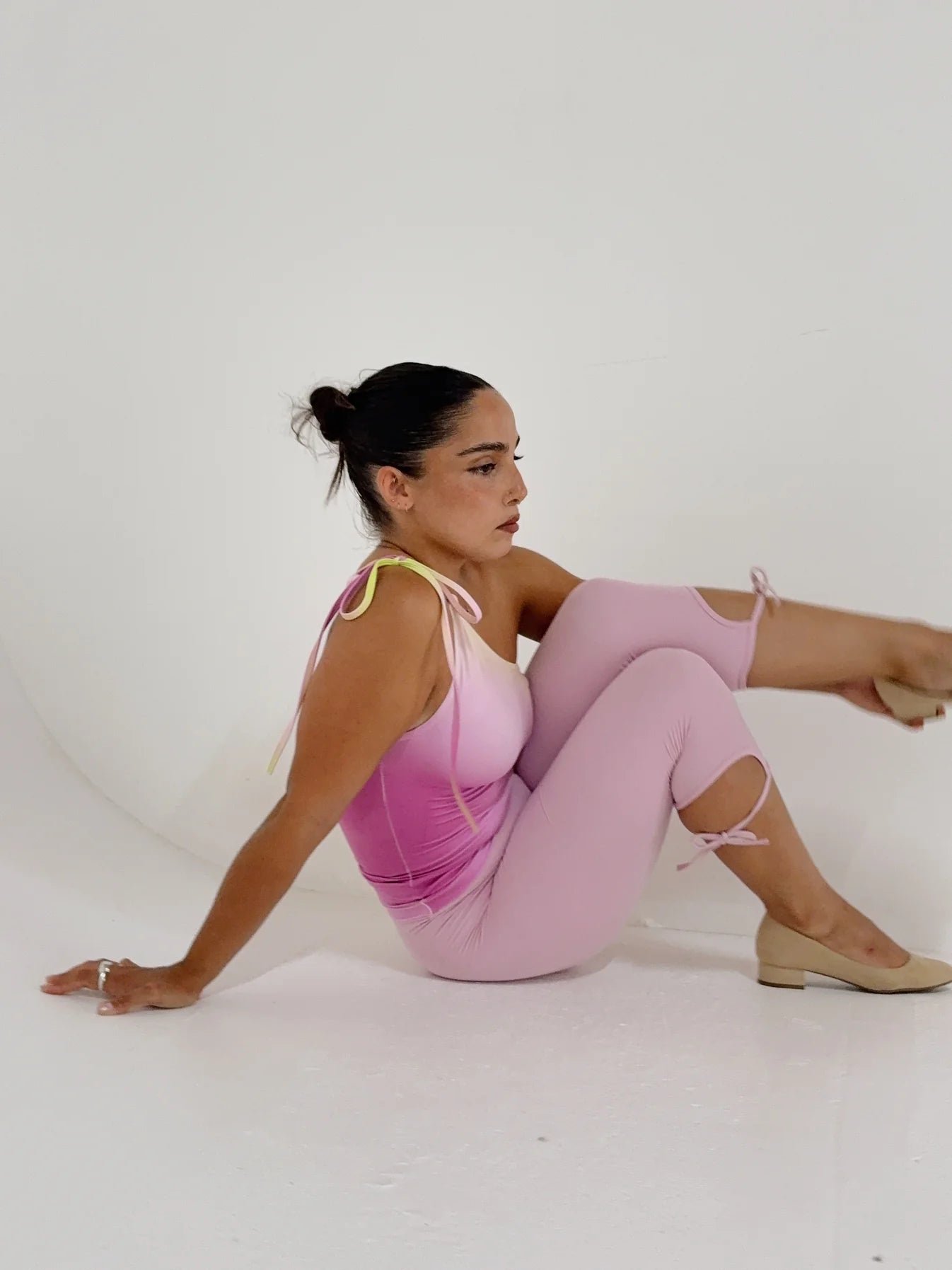 Womens ruched one shoulder top with tie details at waist and shoulder.